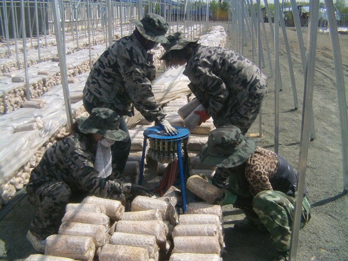 又是一年木耳养殖季节,全场职工忙碌起来,为木耳袋进行打眼。下图为职工正在为木耳袋进行打眼。